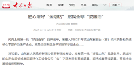 榮耀閃閃,品牌彰顯。 近日,2022年山東省優(yōu)質(zhì)品牌榜單揭曉。山東金塔機(jī)械集團(tuán)“廢液蒸發(fā)成套裝備”、“用于熱敏性物料的蒸發(fā)裝置”榮耀上榜。至此,自2019年榜單發(fā)布以來(lái),金塔集團(tuán)共有10項(xiàng)產(chǎn)品榮獲山東優(yōu)質(zhì)品牌稱號(hào)。 山東金塔集團(tuán)守正創(chuàng)新強(qiáng)主業(yè),精耕細(xì)作鑄品牌,突出以科技創(chuàng)新強(qiáng)化品牌支撐,年年出成果,歲歲有專利,新工藝、新技術(shù)、新產(chǎn)品拓寬了市場(chǎng)新領(lǐng)域。作為《酒精蒸餾塔》、《糠醛水解鍋》、《糠醛蒸餾塔》等20余項(xiàng)國(guó)家行業(yè)標(biāo)準(zhǔn)的制定者,金塔集團(tuán)聚焦雙碳目標(biāo),把控綠色節(jié)能方向,牢牢占據(jù)行業(yè)制高點(diǎn),贏得了市場(chǎng)話語(yǔ)權(quán)。通過(guò)深入實(shí)施品牌戰(zhàn)略,致力打造自主品牌,金塔產(chǎn)品質(zhì)量?jī)?yōu)、品質(zhì)好、標(biāo)準(zhǔn)化的綜合優(yōu)勢(shì)得到全方位厚植。 金塔品牌靚,展示好形象?!敖稹弊旨皥D商標(biāo),中國(guó)馳名商標(biāo);首批“好品山東”,金塔榮耀其中;山東優(yōu)質(zhì)品牌,連年完美上榜…金塔在出新中更加出彩,品牌在打造中愈加閃亮。 品牌閃爍,金塔增色。以品牌樹(shù)形象,以品牌闖市場(chǎng),金塔品牌之路越走越寬廣,為助推企業(yè)高質(zhì)量發(fā)展注入了強(qiáng)大動(dòng)能。
